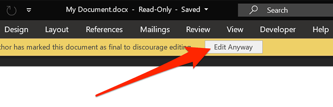 - The next time you open the document, you’ll see a message saying the document is final. If you need to edit it, click on the **Edit Anyway** button.