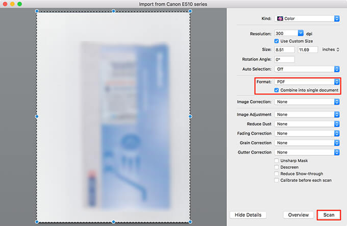 - If you don’t see any options on your screen, select **Show Details** at the bottom. * Select **PDF** from the **Format** dropdown on the right. * Check the **Combine into single document** option. * Adjust other options as needed. * Select the scan preview on the left and press **Command + A** on your keyboard. This selects your entire scan. * Select **Scan** at the bottom.