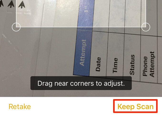 - Point the camera towards the document, and press the shutter button to take a photo of the document. * Adjust the scanned photo using the handlers on the screen. Tap **Keep Scan** at the bottom if the scan looks good. Otherwise, tap **Retake** to take a new photo of the page.