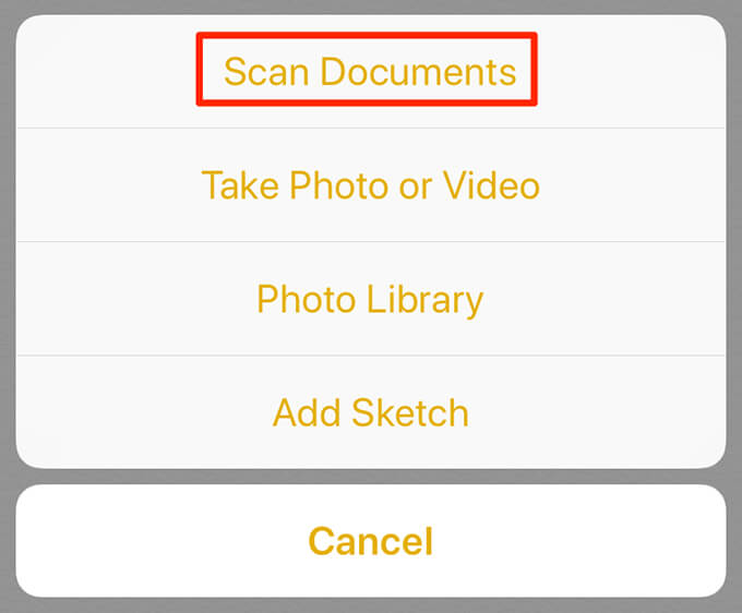 - On the new notes screen, tap the Add (+) sign at the bottom and choose Scan Documents.