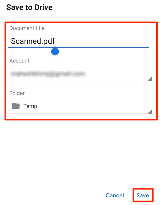 - Name the PDF, choose an account, select a folder to save the file in, and tap **Save**.