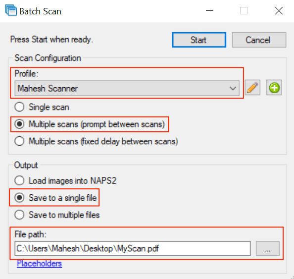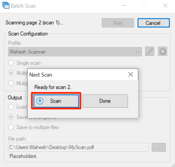 - In the window, select the newly created profile from the **Profile** dropdown menu. * Choose **Multiple scans (prompt between scans)**. * In the **Output** section, select **Save to a single file**. * Then, select the three dots in the **File path** field to choose a folder to save the PDF file in. * Lastly, select **Start** at the top to start scanning the page.