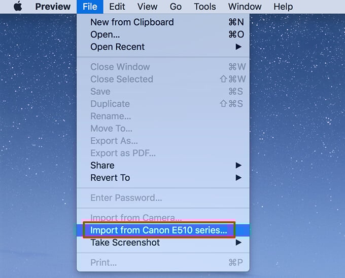 - When Preview opens, select the File menu and select Import from.