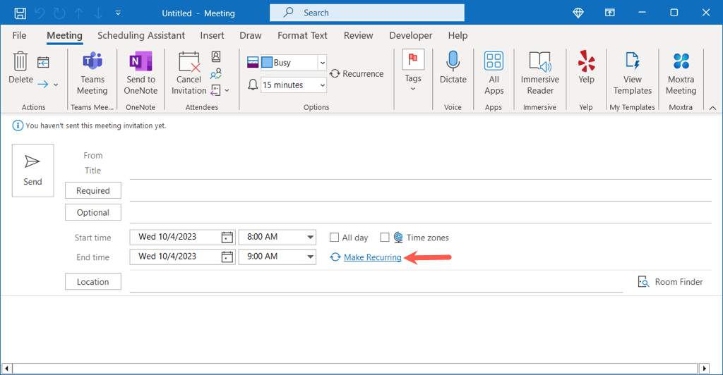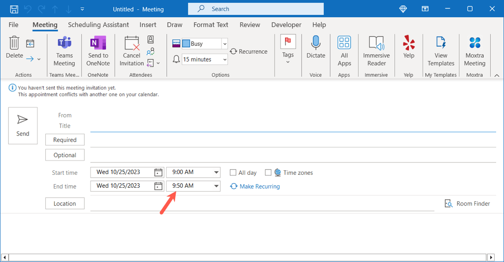 Note: If you double-click the time in a calendar view, this creates an Appointment rather than a Meeting by default.