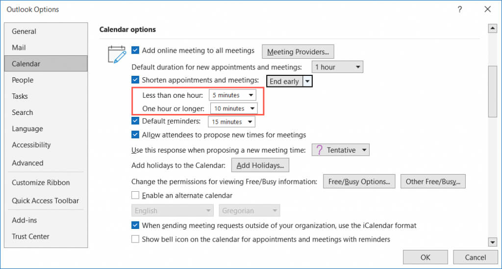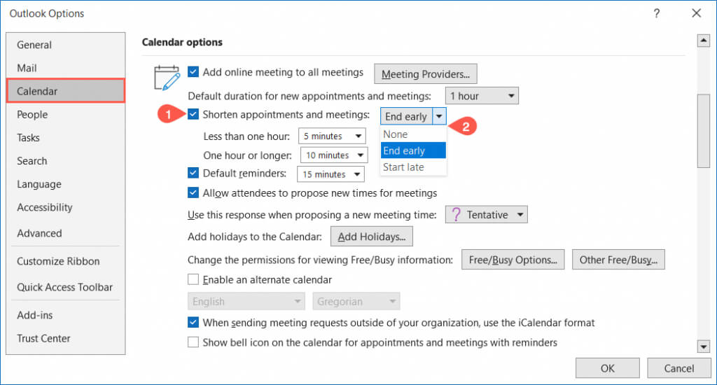 - On the right, go to the Calendar Options section and check the box for Shorten appointments and meetings. Use the drop-down menu to pick End early or Start late.
