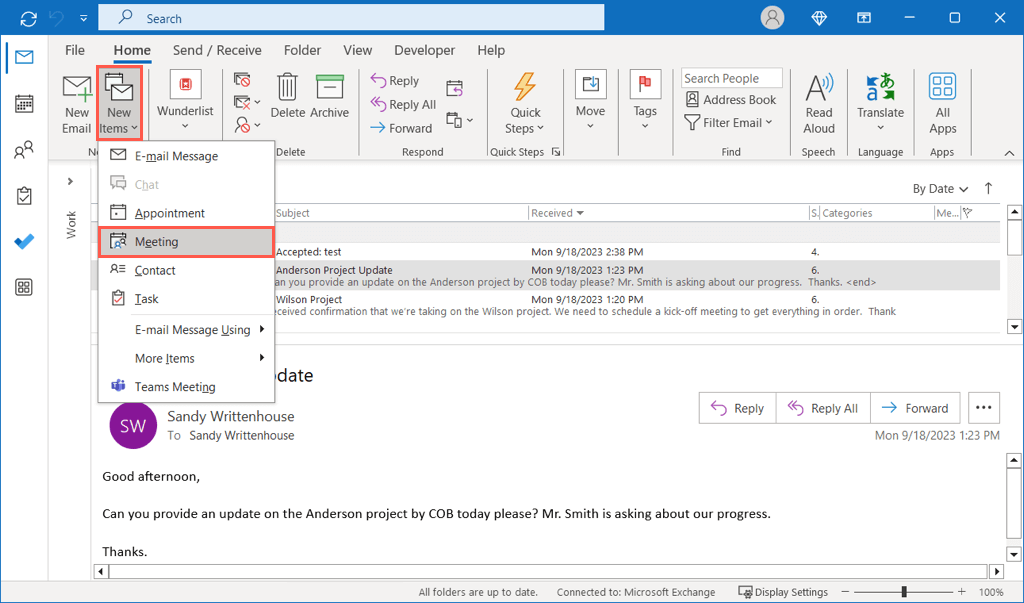 When viewing your inbox, go to the Home tab, open the New Items drop-down menu, and choose Meeting. You can also use the keyboard shortcut Ctrl + Shift + Q.