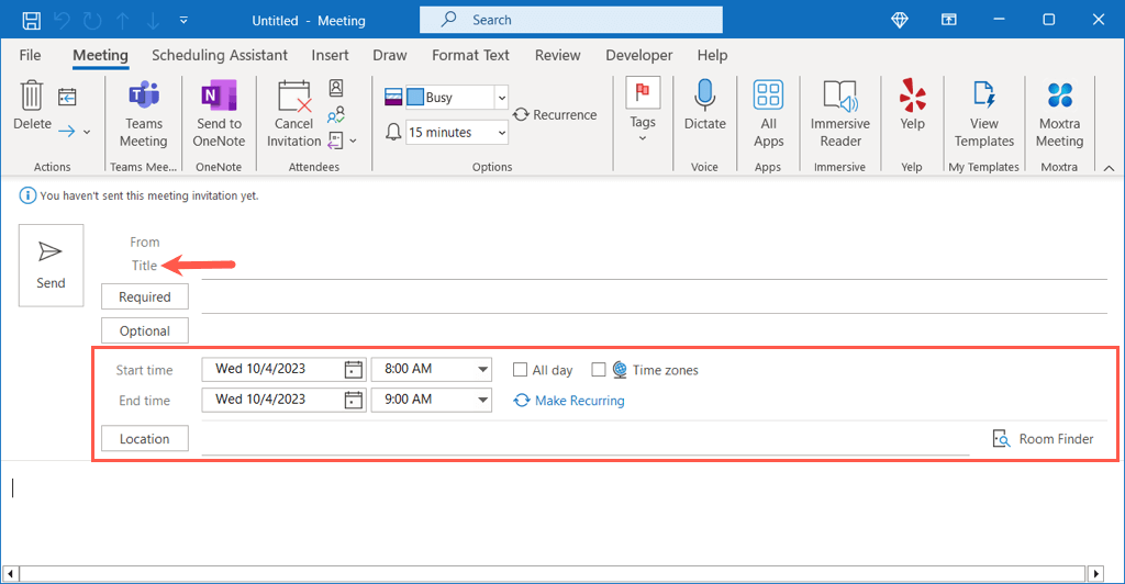 - * Enter the Title, select the Start and End meeting times and optionally pick the time zone, or check the box for an All Day meeting. You can also enter a location or link to an online meeting, or use the buttons for Location or Room Finder if you have these types of items saved.
