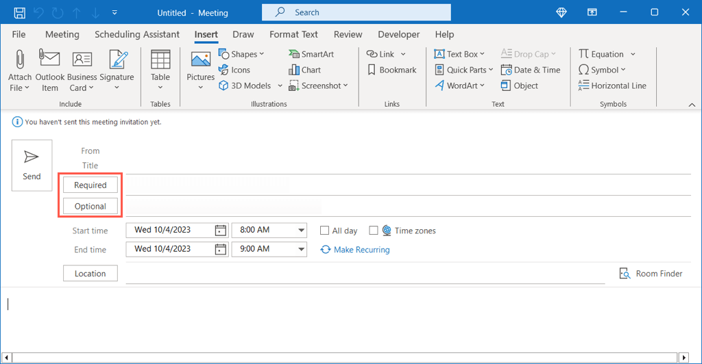 You can quickly add attendees to your meeting by entering their names or email addresses next to Required (those who must attend) or Optional (those who may attend) at the top of the window.