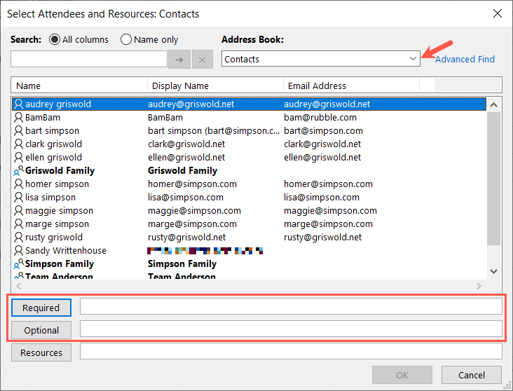 - In the pop-up window, choose an Address Book at the top if you have more than one. Then, select a contact and use the Required or Optional button at the bottom to add them to the meeting.