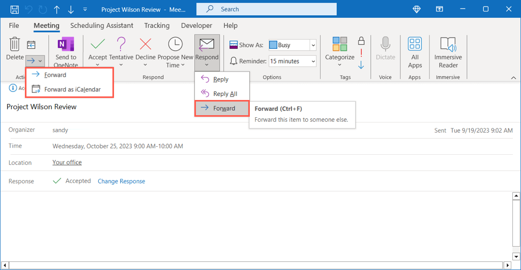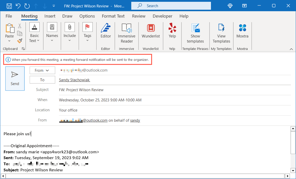 - The meeting organizer will receive a notification that you forwarded the meeting to another person and should see any other changes you made.