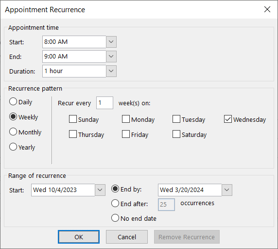 - Then, pick the Start and End times, the recurrence pattern, and the range of the recurrence. Choose OK when you finish to pop this information into the meeting window.