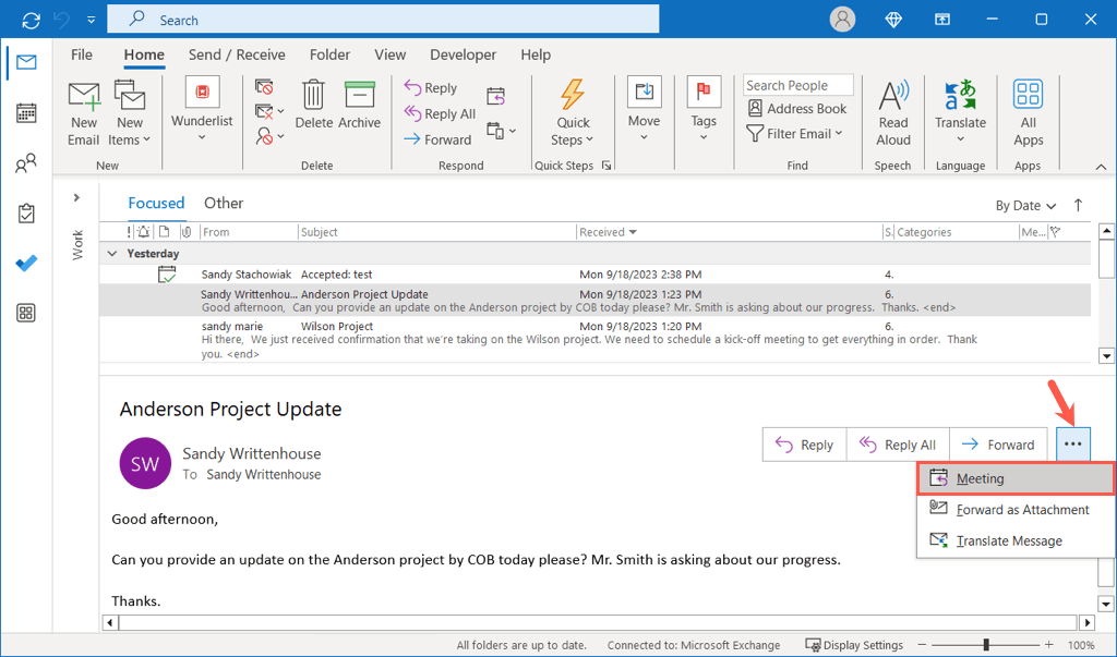 Want to create a meeting from a specific email in Outlook? Select the Other Actions button (three dots) on the message and choose Meeting.