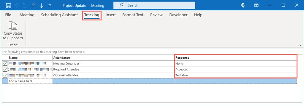 Double-click the meeting to open it and go to the Tracking tab. You’ll see each invitee, if they are Required or Optional, and their Response to your meeting invitation on the right.