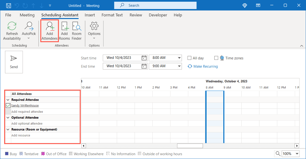 Another way to add meeting attendees is to use the Scheduling Assistant. This feature is available to Microsoft 365 and Exchange account users.