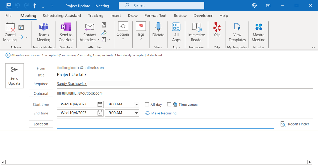 Similar to creating the meeting in Outlook, you have more than one way to add attendees. You can include the participants at any point during the meeting setup. To invite attendees after you schedule the meeting, head to the following section.