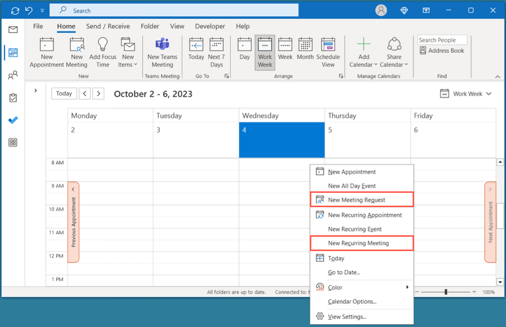 Alternatively, choose the date you want to use and right-click the time. Select New Meeting Request or New Recurring Meeting per your preference.