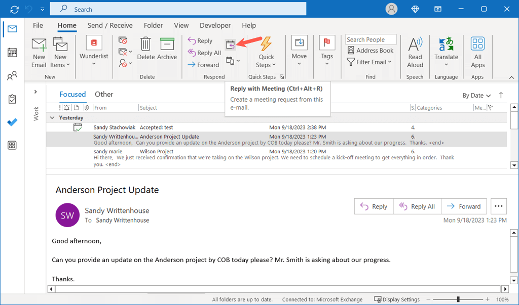 Alternatively, select the email, go to the Home tab, and choose Reply with Meeting in the ribbon or use Ctrl + Alt + R.