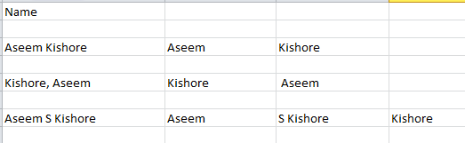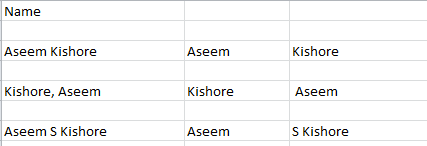 To get started, let’s see how names are usually stored in a Excel spreadsheet. The most common two ways I have seen are firstname****lastname with just a space and lastname, firstname with a comma separating the two. Whenever I have seen a middle initial, it’s usually firstnamemidinitiallastname like below**:**