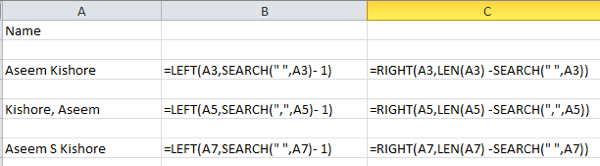 Using some simple formulas and combining a couple of them together, you can easily separate the first name, last name and middle initial into separate cells in Excel. Let’s start with extracting the first part of the name. In my case, we’re going to use two functions: left and search. Logically here’s what we need to do: