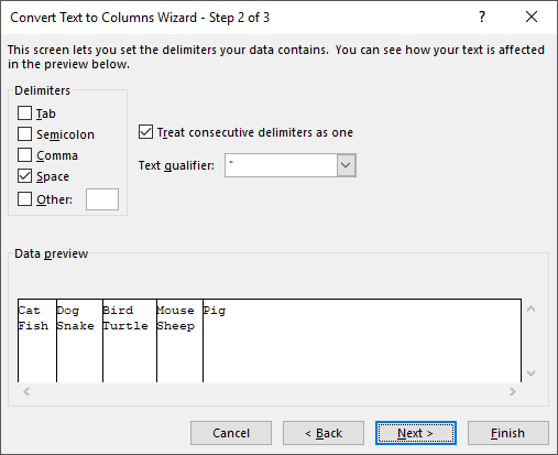 On the next screen, you will choose the delimiter. You can pick from tab, semicolon, comma, space or type a custom one in.