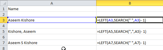 Here’s a simple formula that gets the job done correctly: =LEFT(NN, SEARCH(” “, NN) – 1), where NN is the cell that has the name stored in it. The -1 is there to remove the extra space or comma at the end of the string.