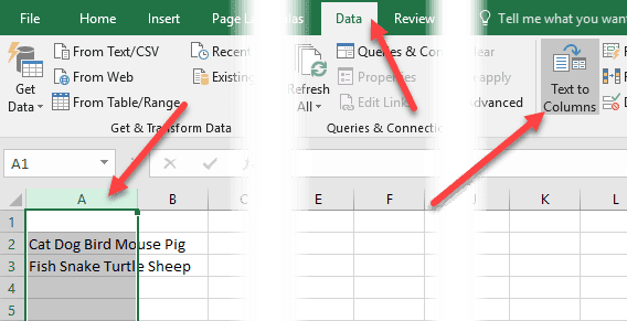 In Excel, first select the column you want to separate. Then, go ahead and click on the Data tab and then click on** Text to Columns**.