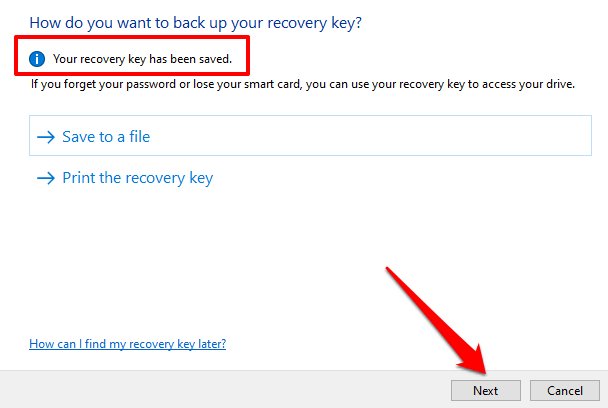 When you get a success message that “Your recovery key has been saved” or “Your recovery key was printed,” select Next to proceed.