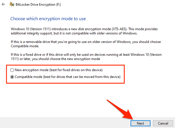 Select New encryption mode if you’ll be using the external drive only on your computer, or on devices running Windows 10 (version 1511 or later).