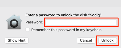 When the encryption is complete, eject and reinsert the encrypted drive, or plug it into another Mac. A password entry window will pop up on the screen; enter the password and select Unlock to gain access.