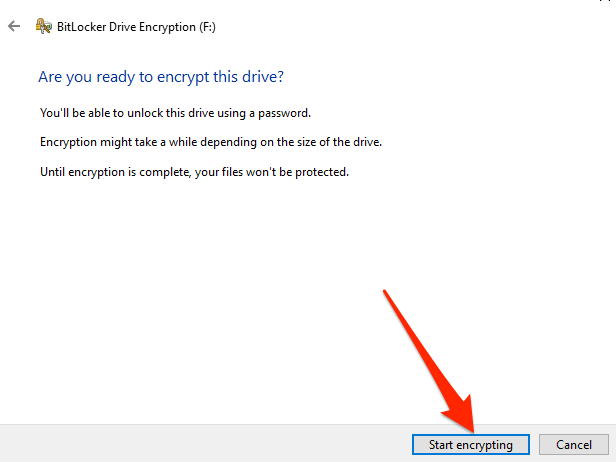 BitLocker will start the encryption of the drive when you select the Start encrypting button.