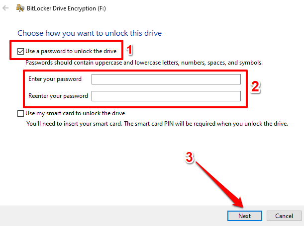 Check the box that reads “Use a password to unlock the drive” and enter your preferred password. Re-enter the password in the provided dialog box and select Next to proceed.