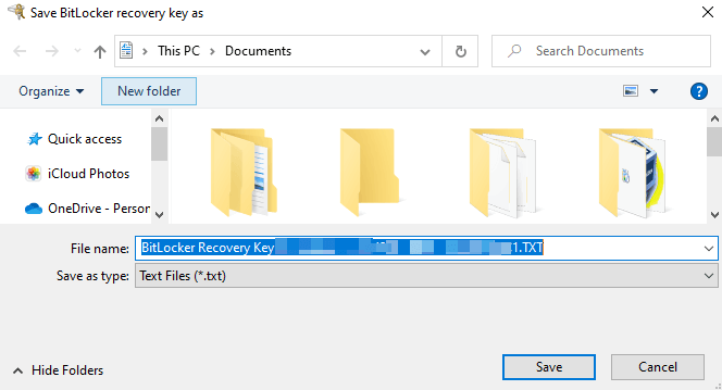 The “Print the recovery key” option will launch a new window where you’ll be able to print the recovery key on paper. If you choose the “Save to a file” option, Windows will encode the recovery key in a text file. Save the file in your preferred folder/location on your PC and select Save.
