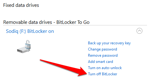 Locate the external drive in the “Removable data drives” section and select Turn off BitLocker.