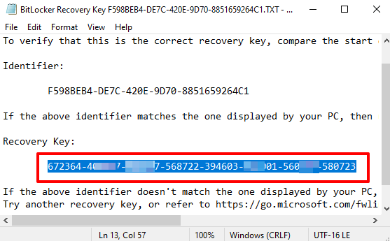 Head to the location where you saved the recovery file, double-click the text file to access its content, and copy the numbers in the Recovery Key section.