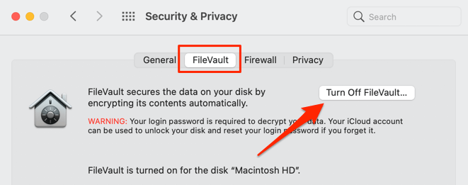 Unlike Windows, you can’t access an encrypted drive on macOS with a recovery key. The only workaround is to turn off FileVault—the macOS encryption engine. Head to System Preferences > Security & Privacy > FileVault and select Turn Off FileVault.