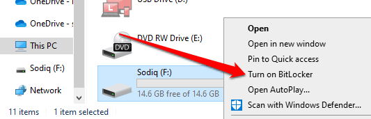 Launch the File Explorer, right-click the external drive, and select Turn on BitLocker.
