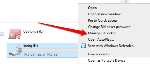 You should now be able to access the drive in File Explorer. If you still can’t remember the password, you’ll have to create a new one. Right-click the drive and select Manage BitLocker.