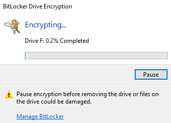 Do not remove the drive from your PC without pausing the encryption. Doing so could damage the drive. If you need to urgently use the drive during the encryption process, select Pause and unplug the drive.