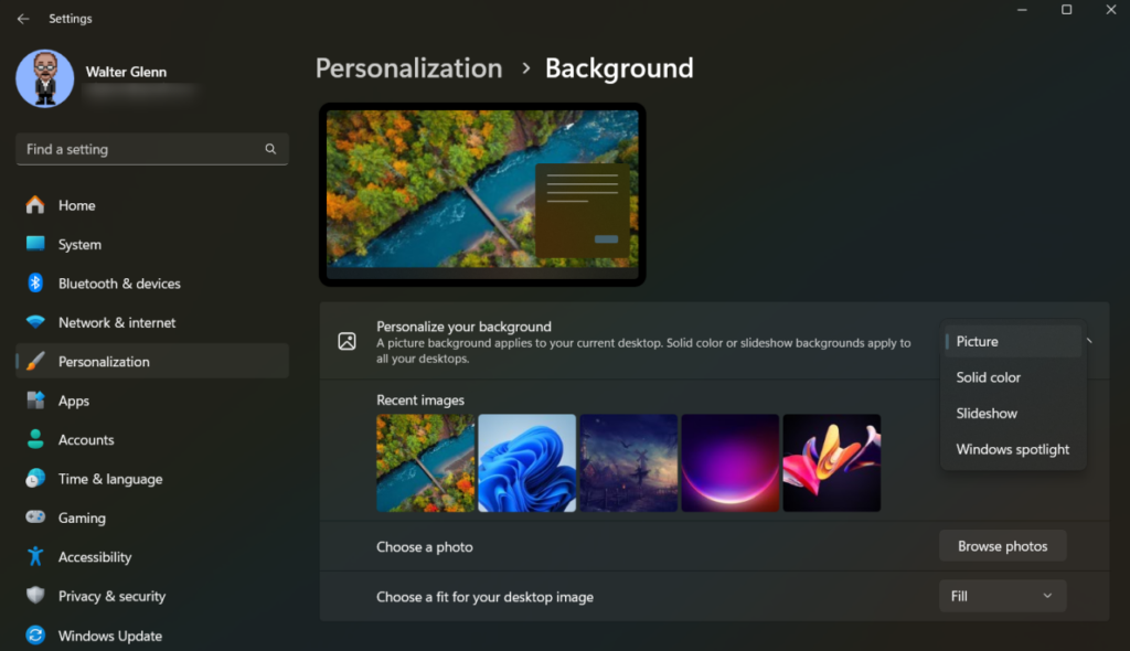 - In the Personalization settings that open, you can choose from various options for your virtual desktop background. These are the same options available when changing a desktop background when you’re not using virtual desktops, including selecting a picture, solid color, or slideshow.