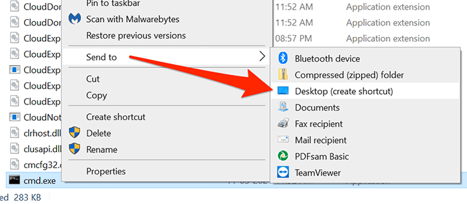 - You should now see a file called **cmd.exe**, which is the Command Prompt executable file. Right-click the **cmd.exe** file and select **Send to** > **Desktop (create shortcut)**.