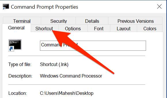 - Select the Shortcut tab at the top of the Properties window.