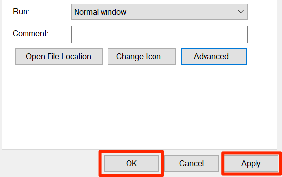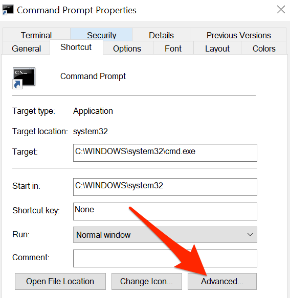- On the **Properties** window, select the **Shortcut** tab at the top. * In the **Shortcut** tab, select the button that says **Advanced**.