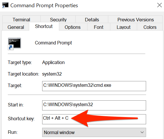 - In the **Shortcut** tab, select the **Shortcut key** field. Know that whatever keyboard shortcut you assign here, Windows will prefix it with **Ctrl** + **Alt**. * Press the key that you want to assign to the Command Prompt shortcut. For example, press **C**. The **Shortcut key** field should display **Ctrl** + **Alt** + **C**.
