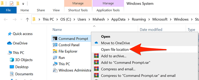 - A File Explorer window opens with a Command Prompt shortcut. Here, right-click the **Command Prompt** shortcut again and select **Open file location**.