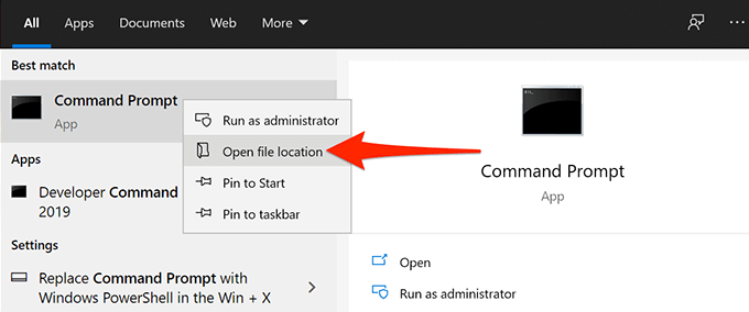 - Right-click Command Prompt in the search results and select Open file location.