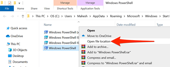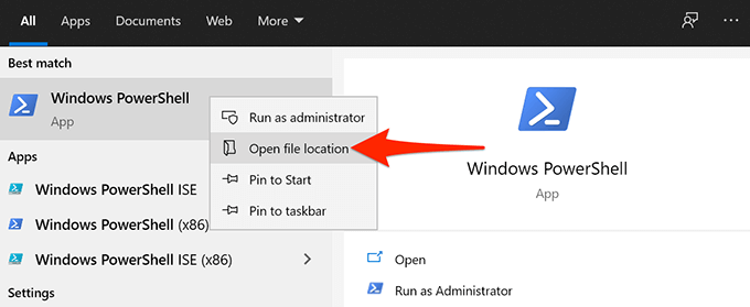 - On the following screen, right-click **Windows PowerShell** and select **Open file location**.
