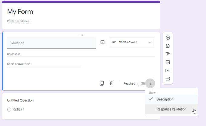 When you need a short answer as a response to your Google Form, you can select the three dots at the lower right corner of that element to add the validation. Just select Response validation to do this.