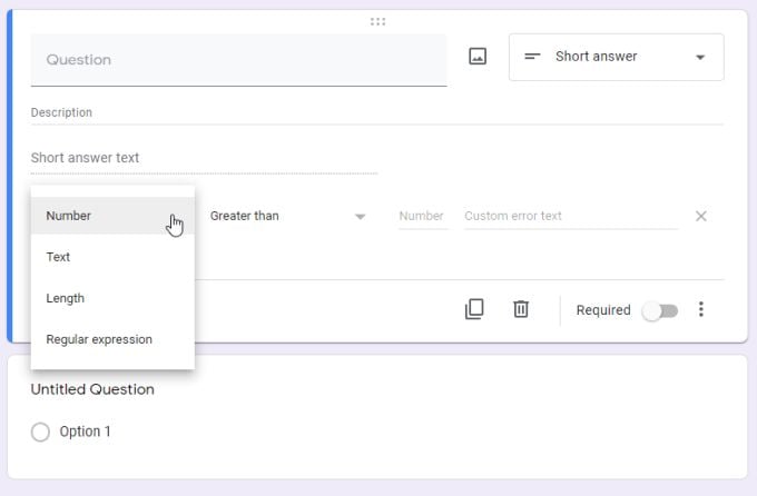 There are three types of questions that come with the ability to use response validation in Google Forms. * Short answer: Single line answers