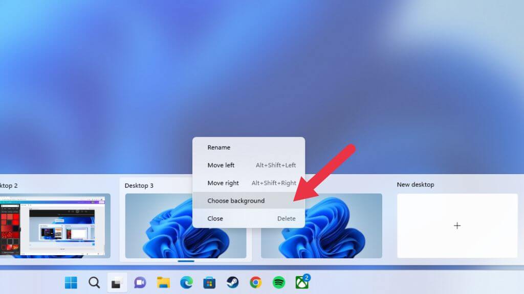 You don’t do this by using the usual Personalize option from the desktop itself. Instead, open the desktop preview mode or Task View and right-click on the desktop thumbnail you want to change the desktop background for.