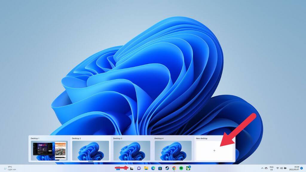 The fastest way to create new virtual desktops in Windows 11 is to hover over the taskbar button and select the new desktop button (+) on the far right of the existing virtual desktops.